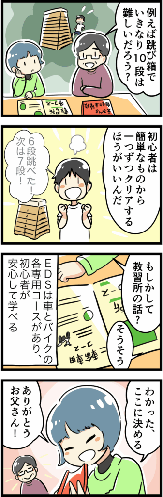 車だけのコースなら、バイクがいないので教習により集中できます。少しずつステップアップできるように進むので、むりなく運転が上手に。「できた!」といううれしい気持ちを重ねながら、自信がどんどんつけていきましょう。